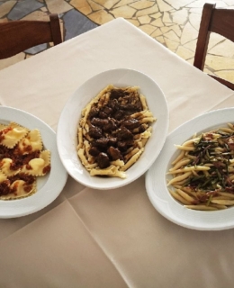 Nakon zamamnih delicija koje smo kušale za predjelo poslužena nam je domaća tjestenina. S obzirom da je trenutno u tijeku sezona cijenjenog bijelog tartufa na meniju su neizostavni bili ravioli punjeni s tri vrste sira i svježe naribanim bijelim tartufom, inače jedno od najtraženijih jela u agroturizmu San Mauro. Božanstveni ravioli savršeno su se sljubili uz malvaziju istarsku (vina San Mauro).