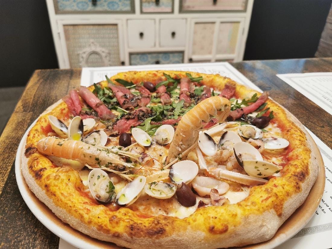 Pizze zanimljivih naziva i nadjeva ističu se iznimnom kvalitetom i posebnošću okusa. Prilikom izrade pizza koriste isključivo brašno Caputo blu iz Napulja, mozzarellu fior di latte, prosciutto cotto te ostale sastojke visoke kvalitete. Kako bi kušale dvije potpuno različite pizze odlučile smo se za kombinaciju pola – pola, pizzu Mare blu i pizzu Burra. Sastojci pizze Mare blu su salsa, mozzarella fior di latte, škampi, jadranske kozice, dagnje, peršin i češnjak, dok su sasla, mozzarella fior di latte, carpaccio istarskog boškarina, pesto od oraha, vrganja i trubača, rukola i domaće maslinovo ulje sastojci pizze Burra. Pizza nas je oduševila i izgedom i okusom.