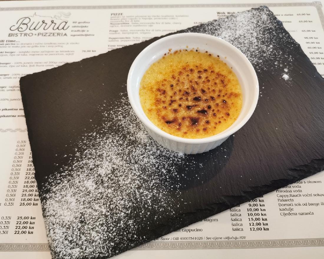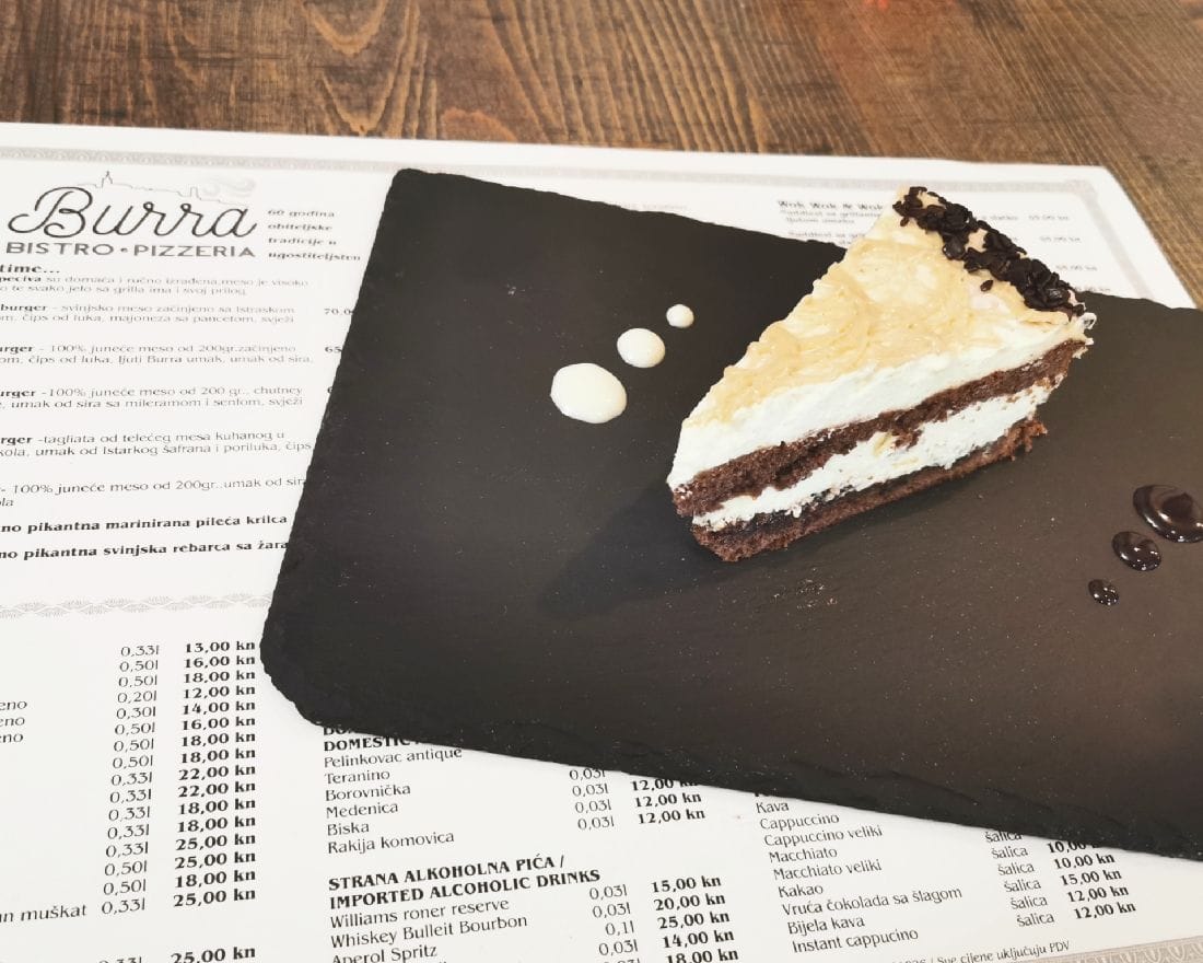 Posebno bi pohvalile pizzeriu Burra po ponudi finih slastica. Imaju vlastitu slastičarku te veliku pažnju posvećuju izradi slastica. Deserti su savršenog okusa, a izbor je zaista velik. Cheesecake sa šumskim voćem, panna cotta s narančom, torta ferrero rocher, torta od amarene i bijele čokolade, pistacio torta, krempite, lava cake sa bijelom čokoladom samo su neke od slastica iz zanimljive ponude. Po preporuci domaćice kušale smo izvrstan cremee brulee s okusom lavande, dok je kremasta kinder bueno torta bila naš izbor.