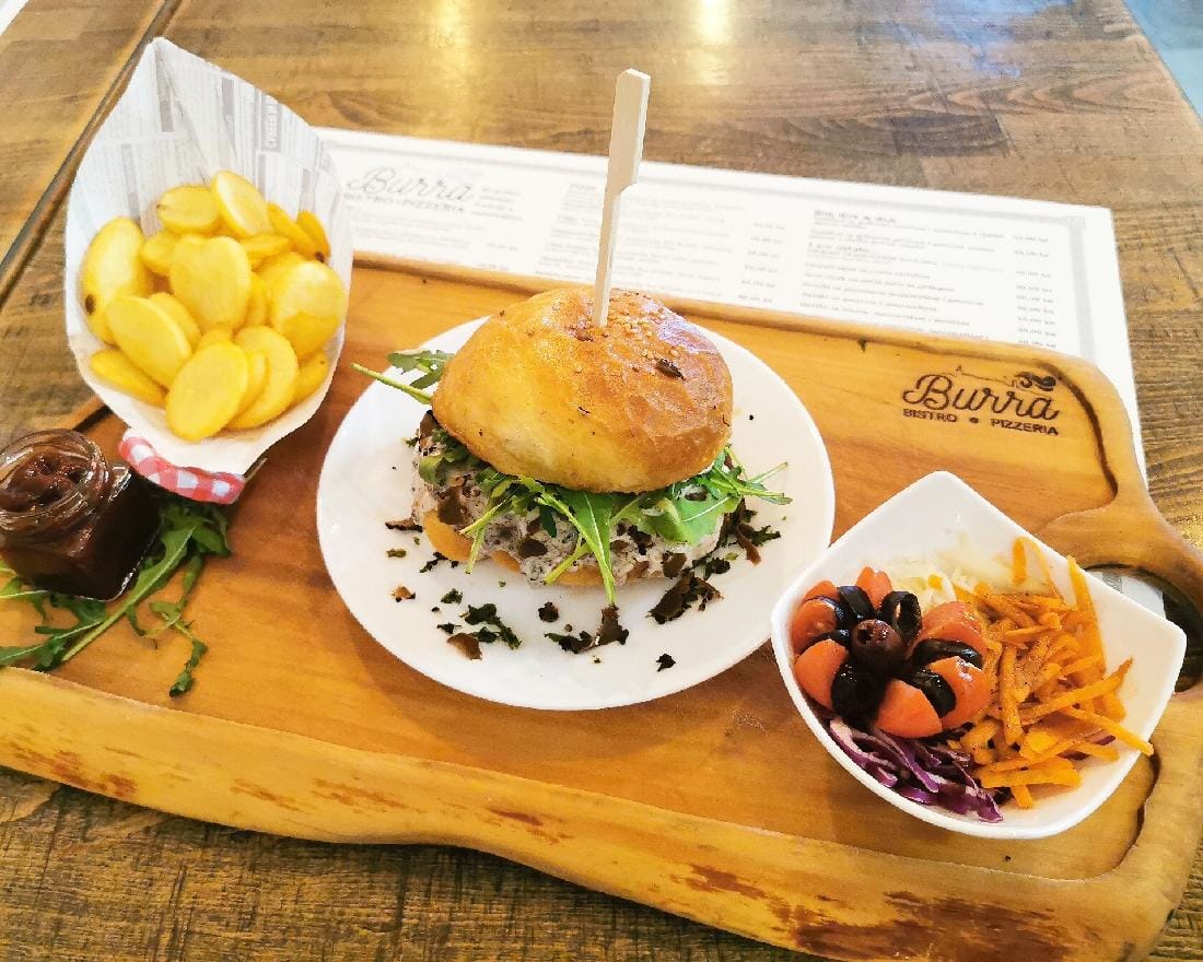 Glavne posebnosti popularnih burgera u Burri su svakako domaća briosh peciva koja su ručno izrađena, umaci koje također rade sami te kvalitetno meso hrvatskog podrijetla. Izdvojile bi Istarski burger ( svinjsko meso začinjeno s istarskom malvazijom, čips od luka, majoneza s pancetom, svježi kupus ) i Sv. Juraj burger ( tagliata od telećeg mesa kuhanog u vakumu, rukola, umak od istarskog šafrana i poriluka, čips od luka ). Naš izbor bio je Trufi burger. Sastojci burgera su 100% juneće meso, umak od sira i tartufate te rukola. Burger je poslužen uz domaći BBQ umak, krumpiriće i svježu salatu. Pecivo je bilo mekano, vrlo ukusno, a odlično pečeno meso savršeno se sljubilo s ukusnim umakom od sira i tartufate.