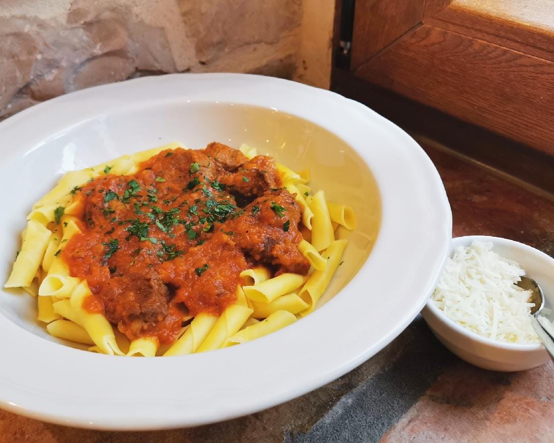 Za toplo predjelo nudi se izbor između rižota (rižoto s gljivama / pikantni juneći) i istarskih fuža. Odabrale smo fuže s junećim gulašom. Moguće je još naručiti fuže s divljači ili s tartufima (crnim i bijelim). Fuži i gulaš nas nisu pretjerano oduševili okusom.