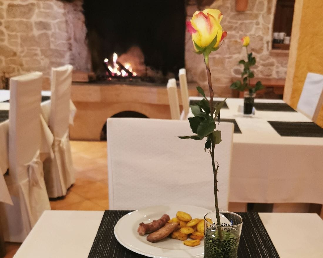 Vlasnica nam je ukratko predstavila ponudu i otpratila nas do sale restorana, gdje je onda brigu o nama preuzela mlada konobarica Sara. Također i salu restorana krasi kamin, a sala odiše ugodom, elegancijom i romantikom. Na stolovima smo odmah primijetile svježe cvijeće koje doprinosi osjećaju ugode. Za vlasnike kućnih ljubimaca definitivno je veliki plus što su kućni ljubimci dobrodošli.